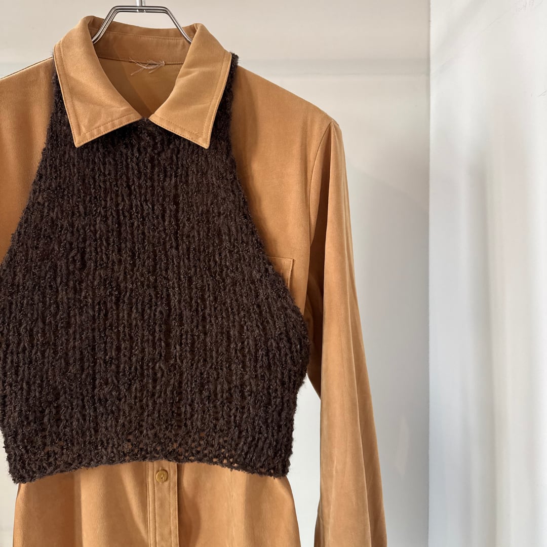 深みのある色目とふんわり感が特徴のタムヤーンとループヤーンを贅沢に引き揃え、ポコポコと楽しい表情の編み地に仕上がりました。