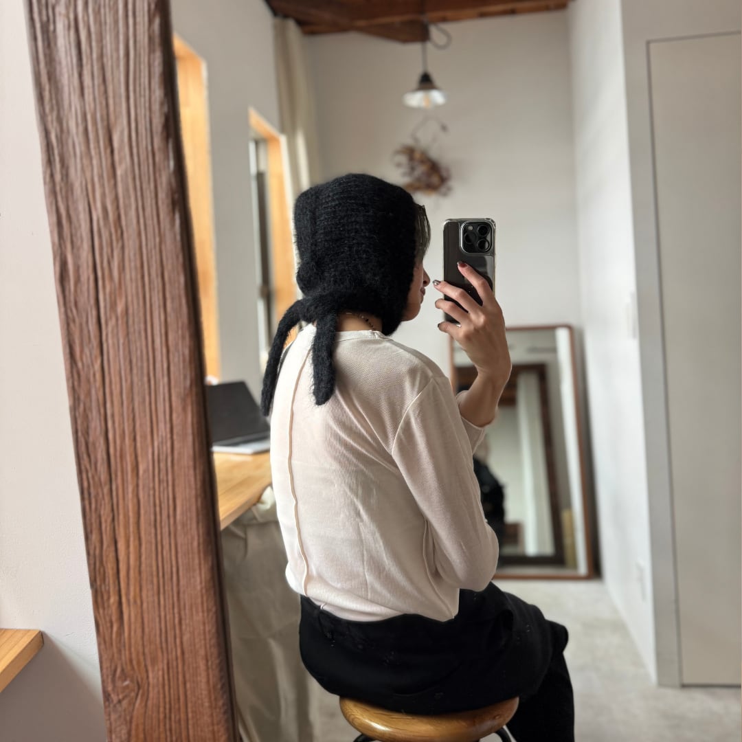 後頭部の減らし目で、頭の形に添う立体的なラインを実現。首元が少し絞られることでフィット感が生まれ、美シルエットと暖かさを両立しました。